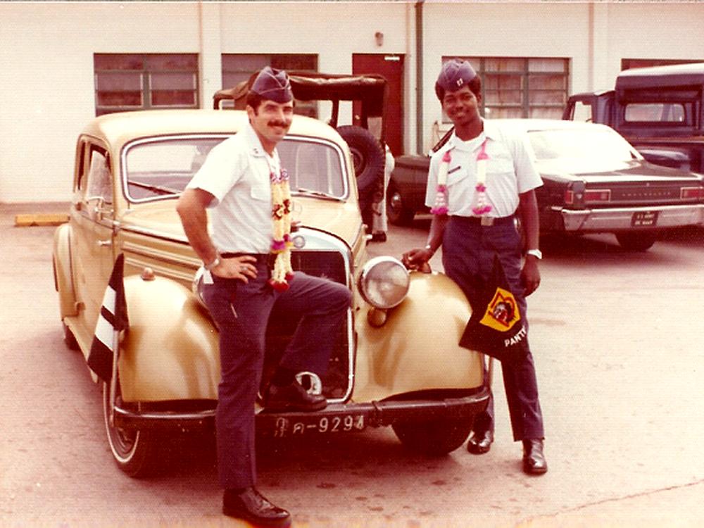 Dana Drenkowski and Tony Marshall, '68, with Ed Young's car, formerly the Argentine Embassy car in Thailand, just weeks after Tony was released from Hanoi. The car has Captain's rank and 13th Squadron flags.