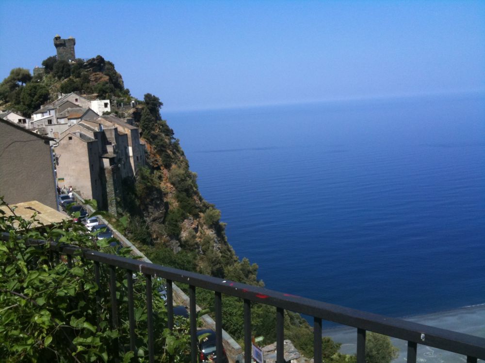 Appreciating one of the many villages perching precariously on cliff sides on Corsica.