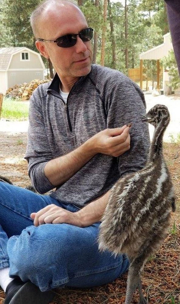 Mark Dudley (son) and their emu yes, this is one of our grandchildren! This little one loves to follow you like a puppy. Such a character!