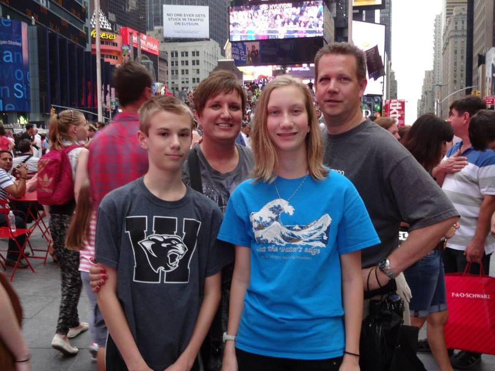 Debbie, Mike, Taylor and Austin Frey (daughter & her family) on vacation, visiting Time Square, NY.