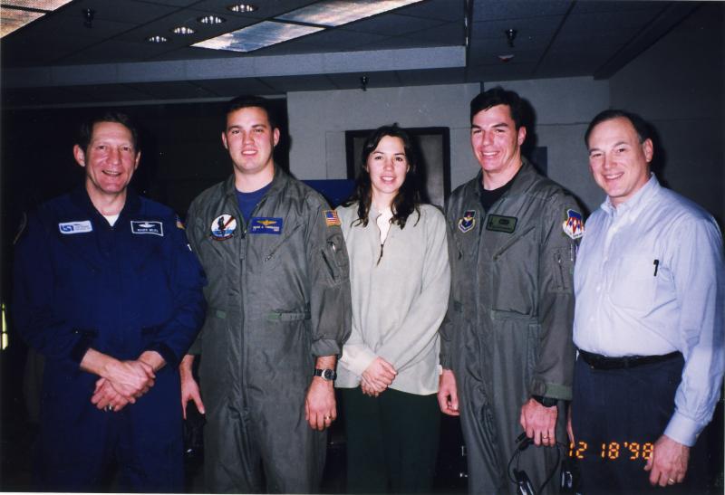 prev | Dec 1998 Vance AFB, OK for UPT graduation for my son-in-law, Jack Antedomenico ('94). L to R: Roger Wiles (simulator instructor extraordinaire!), Mark Jr (transferred to USN to fly), Noemi Antedomenico (Jack's sister and Class of '97), Jack and an old guy. | next |