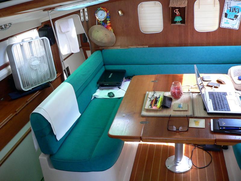 This is the saloon (nautical term) inside Tiki Cat. The Hawaiian bobble-head hula
