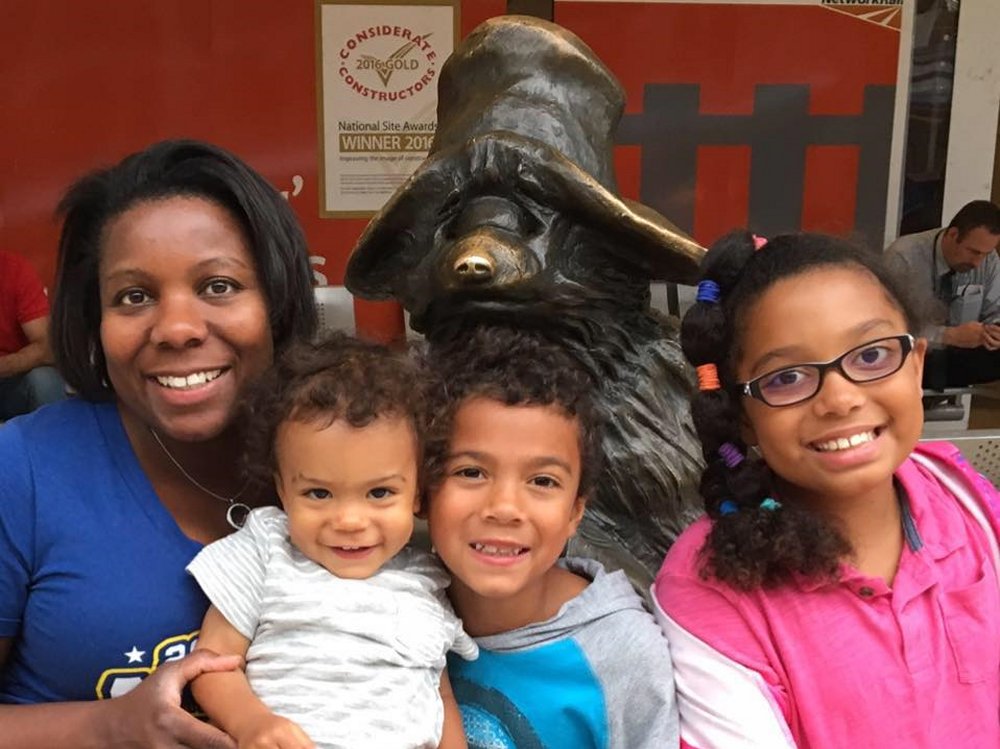Spon, Vance, Jonah and Naomi Russell with Paddington Bear in London