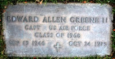 Edward Allen Green, II Mr. Edward A. Greene, II Class of 1968, died on 24 October, 1975 in the VA Hospital, Los Angeles, California after a prolonged illness. He is survived by his wife, Catherine and daughter, Miriam. As a cadet, Mr. Greene majored in physics and was designated as the Class of 1968 Outstanding Cadet in Physics. He was on the Dean's List every semester and on the Commandant's and Superintendent's List his last three semesters. As a First Classman he served as 2nd Cadet Group Administrative Officer. He was a member of the Entertainment Committee, the Ski, Physics, and Aero Clubs, and was active in the Protestant Choir and Glee Club. He was named Colorado Cadet of the Year for 1968. Upon graduation Mr. Greene was awarded the Atomic Energy Commission Fellowship in Nuclear Science and Engineering at the University of California, Davis. He was later assigned as a research physicist at the Air Force Weapons Laboratory at Kirtland AFB, NM. He resigned from the Air Force in July, 1972. Funeral services for Mr. Greene were held in Los Angeles, California. He was interred in the Academy Cemetery. |