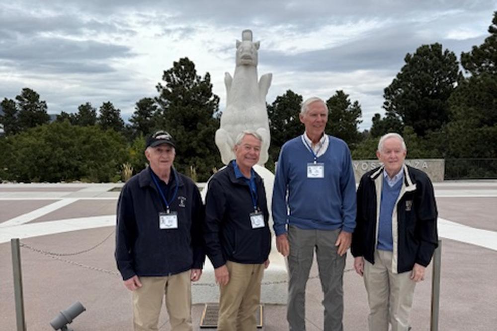 We attended an Air Force versus Denver hockey game. DU is a top rated, NCAA Champion, team with a dozen members offered a place on NHL teams. Air Force held them scoreless until the last four minutes when DU tied the game 1-1. AF lost in a shootout after overtime. Great game. The visit included a visit to the SEA Memorial Pavilion where four grads posed by Pegasus: Bruce Buono, John Dunham, Skip Pardee and Charlie Coolidge. Next year is San Diego. Bruce |