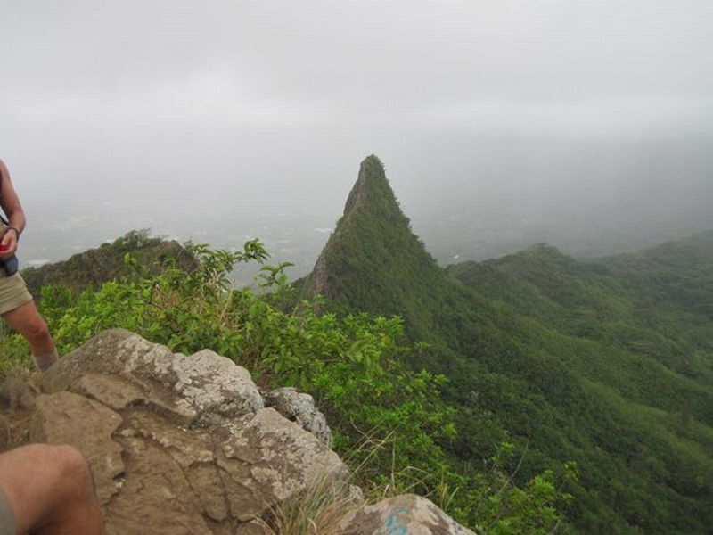 View of the 3rd Peak from the 1st Peak with Vic and Ted on the left. There are different reports about how high this mountain is, but most of the people who write about it say it's somewhere between 1,600 and 1,800 feet. Another similar hike near Olomana is "The Stairway to Heaven" which is actually a real metal stairway/ladder system that the military built in the 1950's to get on top of the Koolau Range to put in a radar and LORAN system. |