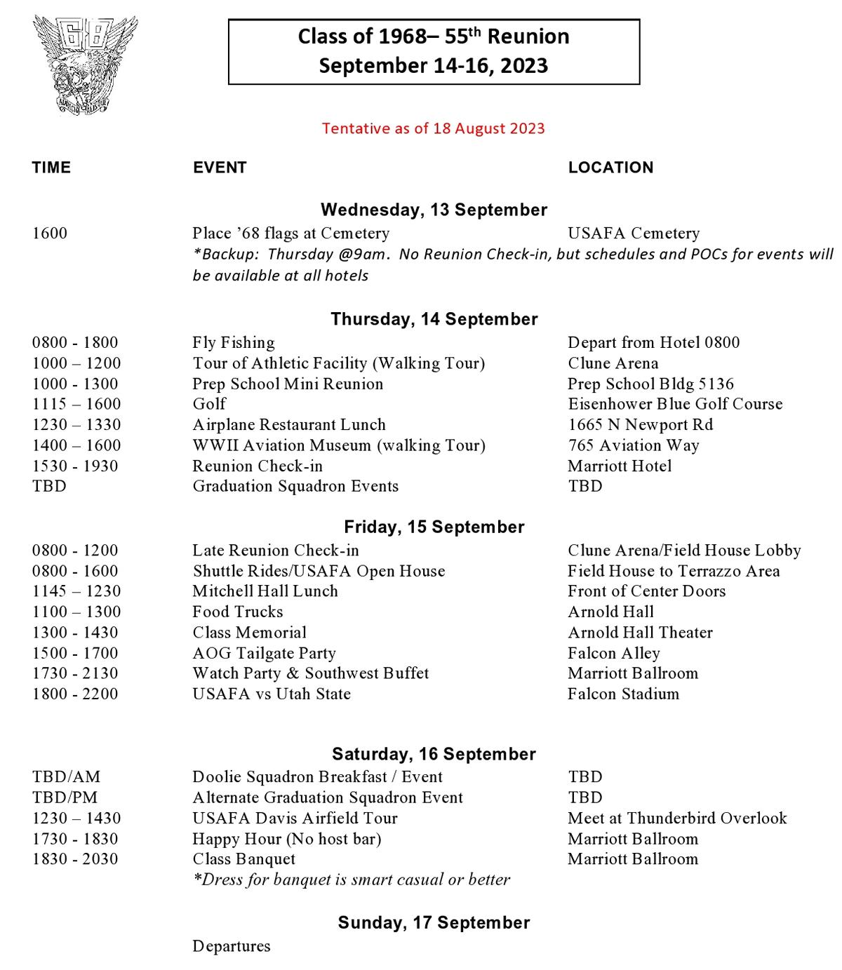 We are confirmed for our 55th reunion September 14-16, 2023.